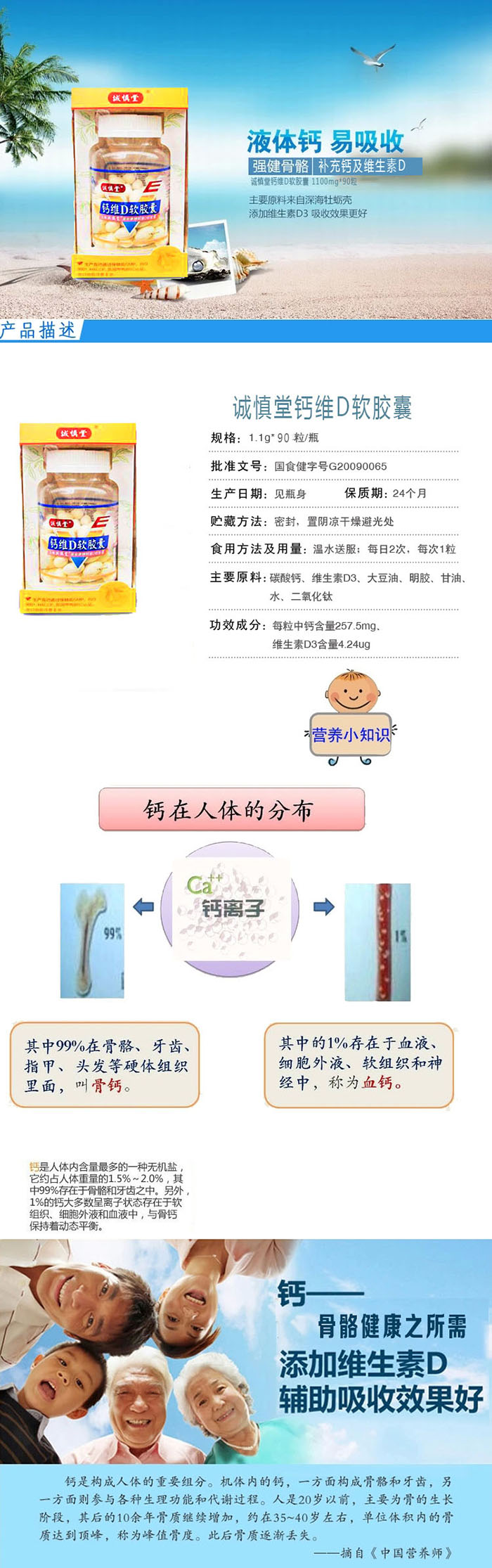 功能特点:钙维D软胶囊是以深海牡蛎壳为主要原料,经1200度的高温煅烧,其碳酸钙的含量达到99%以上,并特别添加了D3,有效地提高了对钙的吸收。并把其微粉化处理,细度达到以上便于吸收。钙与胶原蛋白构成骨骼、软骨、软组织等人体组织。补钙可以预防部分癌症的发生,并且能稳定血压,并能提高免疫力。钙元素参与骨骼肌与心肌的收缩互动,补钙可以防止心律失常与肢体抽筋。适宜人群:1、孕产妇、生生长发育期的儿童、青少年;2、腰酸背疼腿抽筋、腿脚无力易骨折;3、进入更年期的人士及中老年人士;4、骨质疏松,骨软化,佝偻病,肌肉抽搐,痉挛的人士。规格:1.1g*90粒食用方法:每日2次,每次1粒