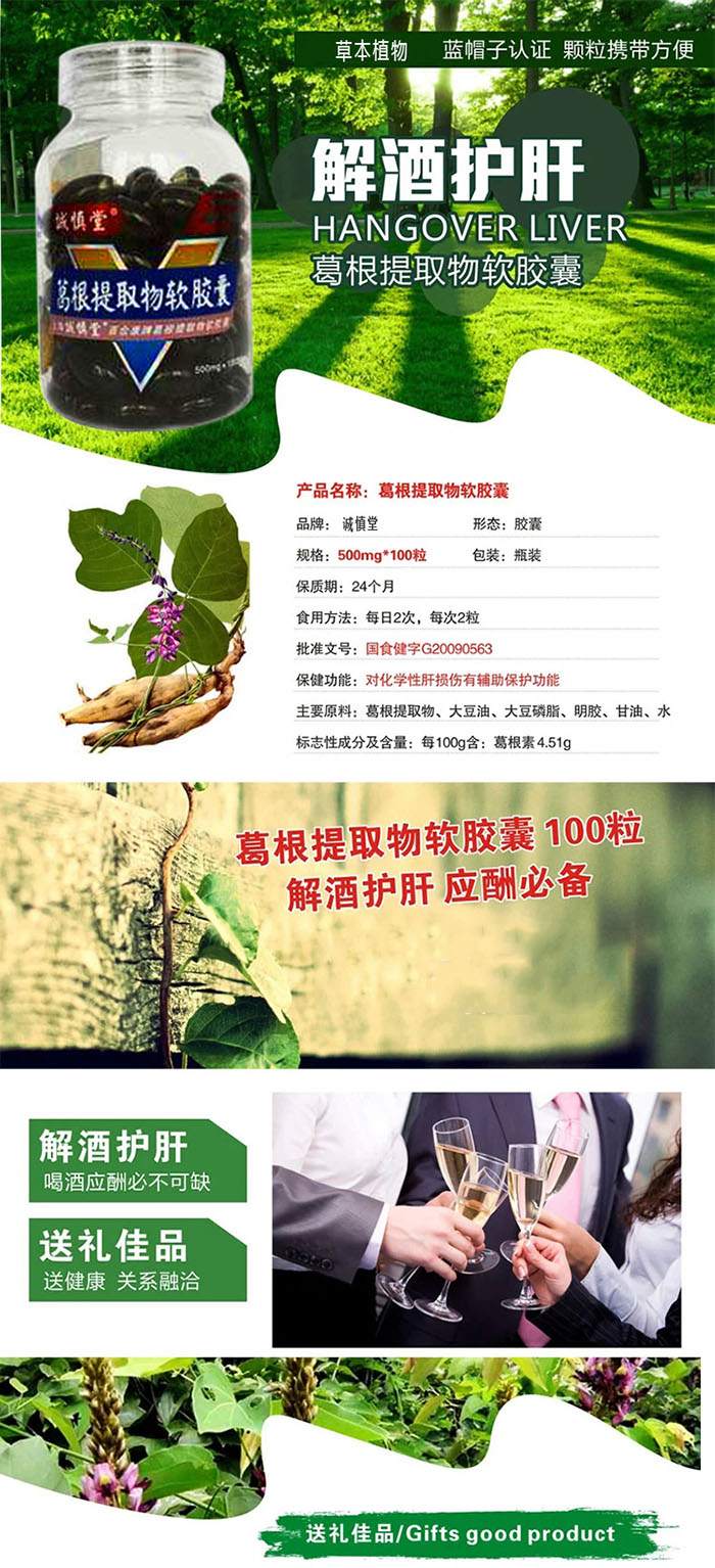 功能特点: 本品是以葛根提取物、大豆油、大豆磷脂、明胶、甘油、水主要原料制成的保健食品,经动物功能试验证明,具有对化学性肝损伤有辅助保护作用的保健功能。 葛根内含12%的黄酮类化合物,如葛根素、花生素等营养成分,还有蛋白质、氨基酸和人体必需的铁、钙、铜、硒等矿物质,具有对化学性肝损伤有辅助保护作用的保健功能。可避免空腹饮酒或过量饮酒对人体造成的伤害;醉酒者服用本品,有解酒醒脑、保护肝脏的作用。 适宜人群: 1、有化学性肝损伤危险者、经常饮酒者; 2、希望保持乳房长久健美挺拔的女性; 3、内分泌不调、痛经的女性。 规格:500mg*100粒 食用方法:每日2次,每次2粒