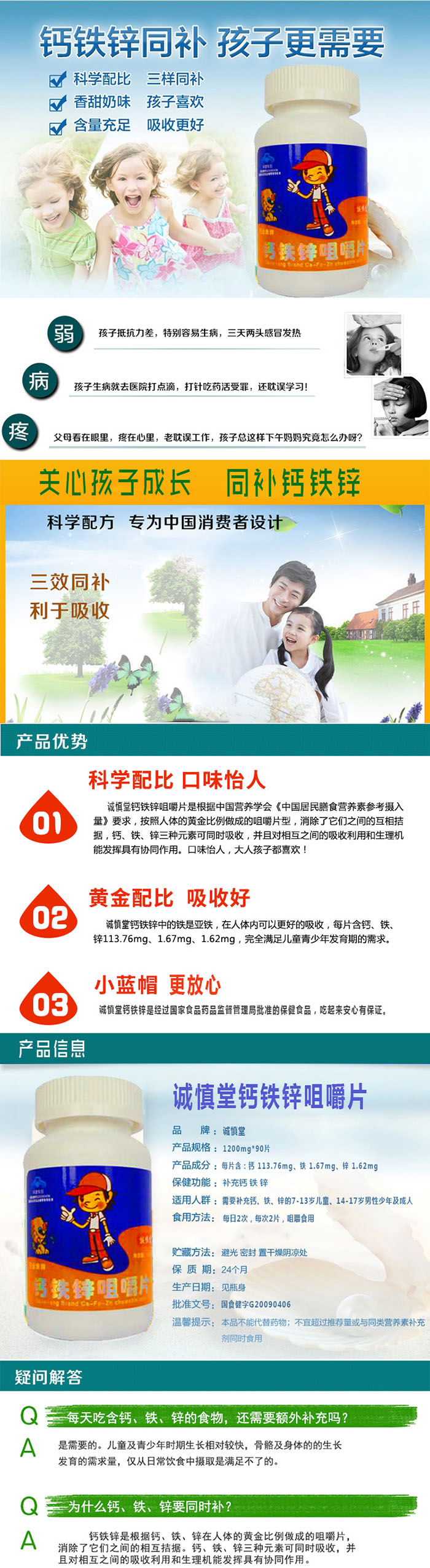 功能特点:钙是人体的生命之源,是人体含量最丰富的无机元素,铁是生成血红蛋白的必要物质。锌是微量元素的一种,对机体的性发育、性功能、生殖细胞的生成却能起到举足轻重的作用。钙与胶原蛋白构成骨骼;钙与钾离子维持心脏节律稳定;降低细胞血管通透性,控制神经肌肉传递(抽筋)。铁参与血红蛋白(血液)与肌红蛋白(肌肉)的构成。锌是体内数十种酶的主要成分,锌还与大脑发育和智力有关。适宜人群:1、需要加强骨骼肌肉健康的人士;2、腰酸背疼、腿抽筋、腿脚无力、易骨折人士;3、孕产妇、生长发育期的儿童、青少年;4、动脉硬化、高血压、心律不齐人士5、提高记忆力、减少铝吸收。规格:1200mg*90片食用方法:每日2次,每次2片,咀嚼食用