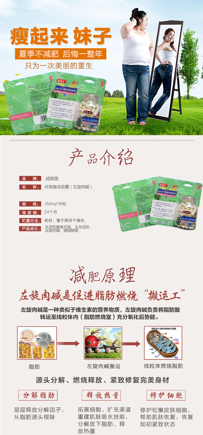 功能特点: 本品以水溶性膳食纤维、玉米淀粉、左旋肉碱、硬脂酸镁为主原料,利用进口生产线在GMP净化车间,严格按照ISO9001质量标准进行生产的营养食品。 左旋肉碱是一种促使脂肪转化为能量的类氨基酸,对人体无毒副作用,主要生理功能是促进脂肪转化成能量,在减少身体脂肪、降低体重的同时,不减少水分和肌肉,在2003年被国际肥胖健康组织认定为最安全无副作用的减肥营养补充品。 适宜人群: 本品特别适合肥胖人群食用,配合做有氧运动,效果更显著。不推荐给患有肝脏或肾脏疾病的人士使用。 规格:350mg*90粒 食用方法:1天2次,1次2粒