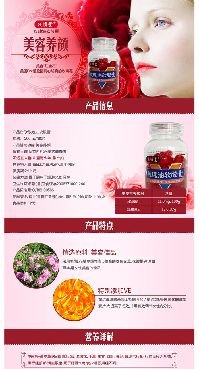 本品以玫瑰油(重瓣红玫瑰)、维生素E为主原料,以法国罗赛洛明胶为胶囊壳,利用进口软胶囊生产线在GMP净化车间,严格按照ISO9001质量标准进行生产的营养食品。 玫瑰精油中的低聚花青素原(OPC)花欧美等国家享有“皮肤维生素”、“口服化妆品”的美誉。它能有效清除自由基、抑制形成黑色素、雀斑的酪氢酸活性。并且玫瑰油还被誉为“精油皇后”,能快速有效地平衡女性荷尔蒙,促进阴道分泌,调节月经周期,有效地改善性冷淡及性无能,是极好的催情剂,保养卵巢、子宫的最佳补品。 适宜人群: 1、皮肤粗糙、肌肤松弛、容易产生细纹、注重肌肤美容保养者; 2、 痛经者。 规格:500mg*80粒 食用方法:一日两次,一次两粒,温水送服。 |