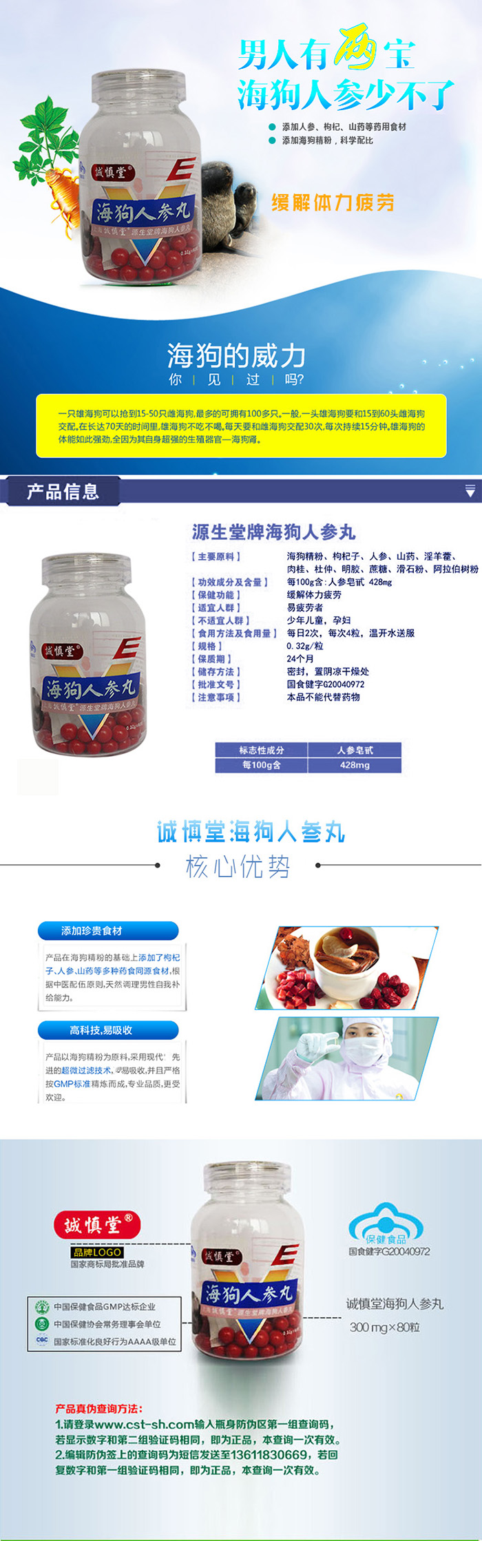功能特点: 海狗是生活在加拿大北极圈内的深海哺乳动物,被称为北极瑰宝。海狗肌体含有八种人体必需但自身不能合成的氨基酸。雄性海狗具有超强的抗寒能力与体力,一只雄性海狗能有数十只雌性海狗配对。同时,海狗肌体还含有大量的粘性蛋白。人参中富含人参皂甙和人参多糖,能提高血液中的氧气载体“红细胞”的寿命和存活率,因此可以增强人体内各类组织细胞对氧及其他养分的吸收。具有滋补强壮、提高体力和脑力的作用。 适宜人群: 1、由肾虚引起的腰膝酸软、四肢无力者; 2、头晕目眩、神疲乏力、畏寒肢冷、耳如蝉鸣者; 3、尿频尿急、淋漓不尽、阳痿早泻者; 4、性生活频繁者; 5、不孕不育患者; 6、失眠健忘的成年男性和女性。 规格:0.32g*80粒 食用方法:每日2次,每次4粒,温开水送服 |