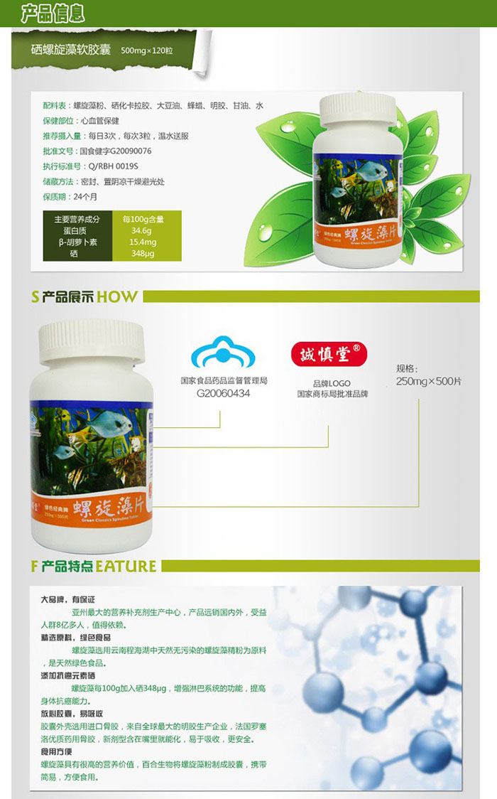 功能特点: 本品是以螺旋藻干粉、微粉硅胶为主要原料制成的保健食品,经动物功能试验证明,具有增强免疫力的保健功能。 螺旋藻-属蓝藻类,呈墨绿色,因呈螺旋形得名,其细胞长度不到 1 毫米;螺旋藻是地球上最早出现的原始生物之一,具有悠久的人类使用历史,现代营养学家称之为“人类营养的微型宝库”,螺旋藻被联合国粮食与农业组织( FAO )誉之为“二十一世纪最理想和最完美的食品”。 适宜人群: 1、 改善酸性体质,提高人体免疫力、缓解疲劳。 2、 对胃炎、胃溃疡等胃病能起到很好的保护作用。 3、 调节血脂和胆固醇,对高血压、糖尿病、心脏病等心脑血管疾病病情稳定有显著作用。 4、 高蛋白、低脂肪、富含天然植物营养素,有助于清除体内毒素、美容护肤、控制体重、保护肝脏 规格:250mg*500片 食用方法:每日3次,每次8片